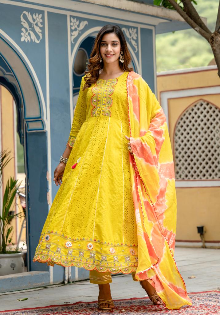 Anarkali Kurta Set Embroidery Work Colour Yellow Schiffli Cotton