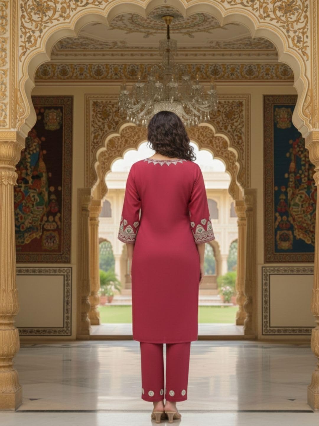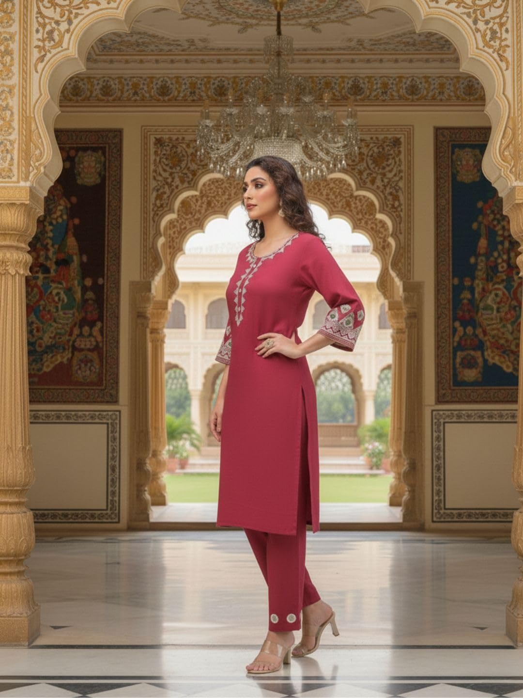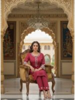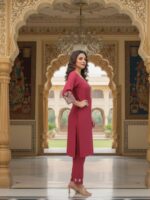Step into timeless elegance with this exquisitely crafted maroon kurta set, designed for the modern woman who values sophistication with subtle festive charm