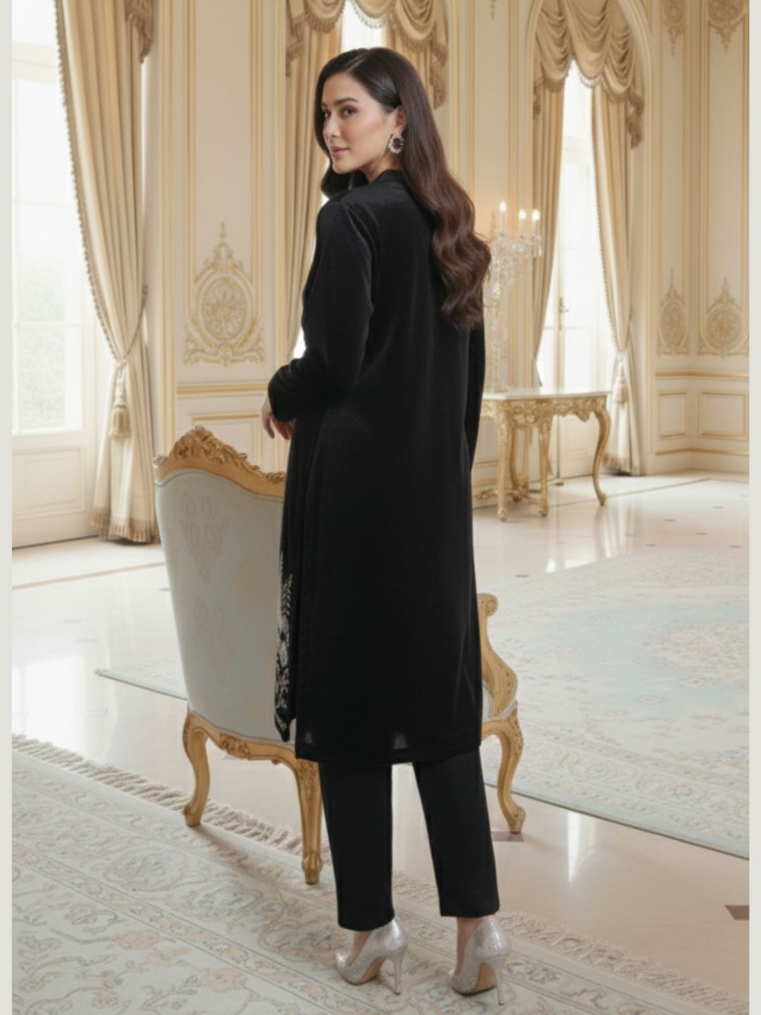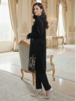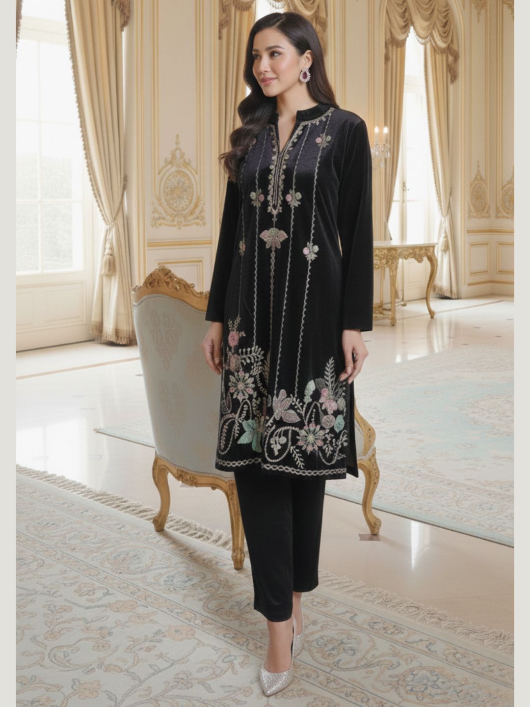 Enhance your festive wardrobe with this elegant women’s black velvet kurta set, designed to offer a perfect blend of luxury and comfort. Crafted from premium velvet fabric, the kurta features delicate floral embroidery with intricate detailing on the front and hem, adding a refined and graceful appeal.