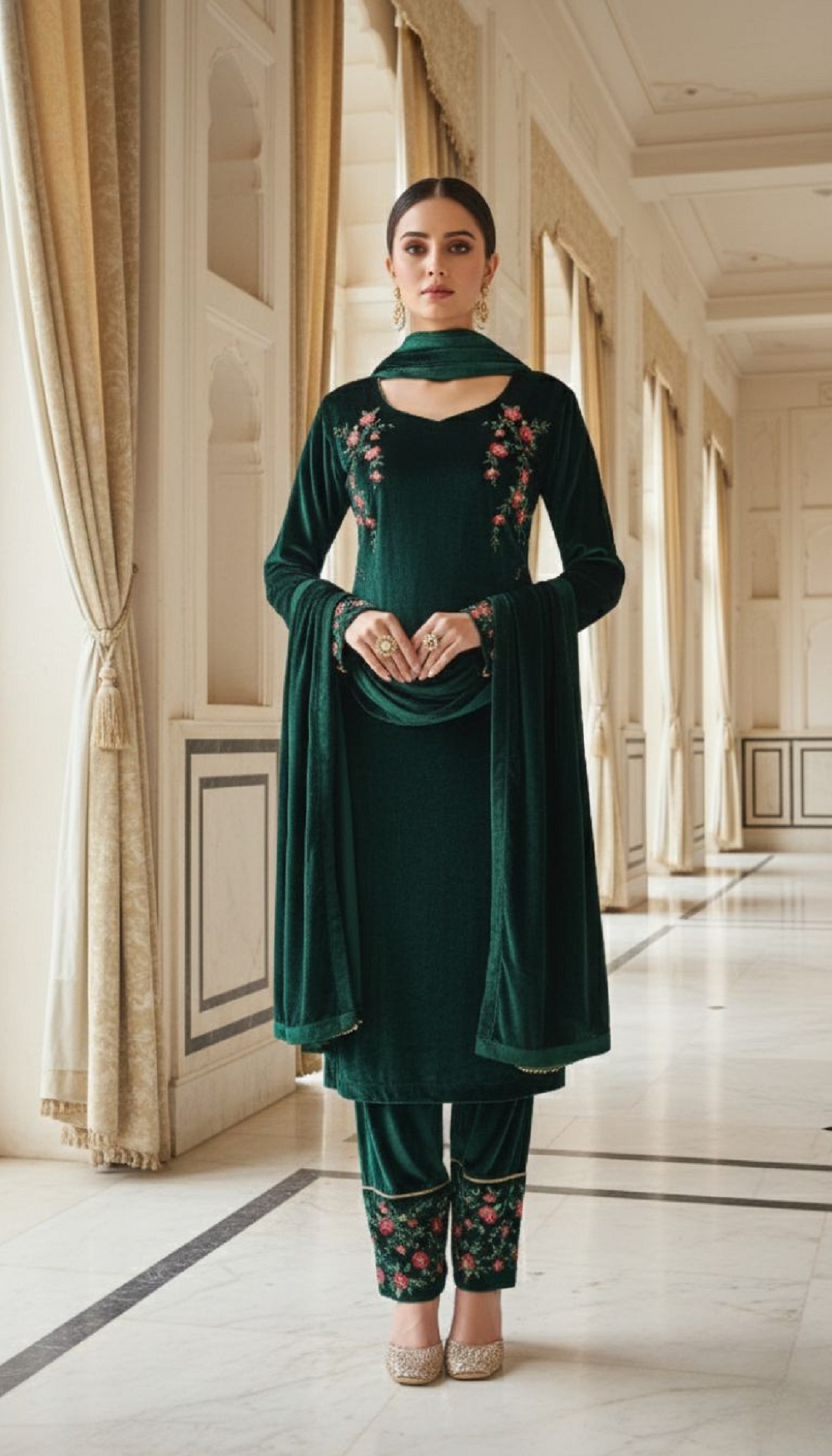 Crafted from premium, soft-to-touch velvet, this ensemble features intricate ethnic embroidery along the neckline and cuffs, adding a touch of sophisticated shimmer to your festive look. The rich jewel tone and the natural sheen of the fabric make it an ideal choice for winter weddings, evening galas, or festive celebrations.