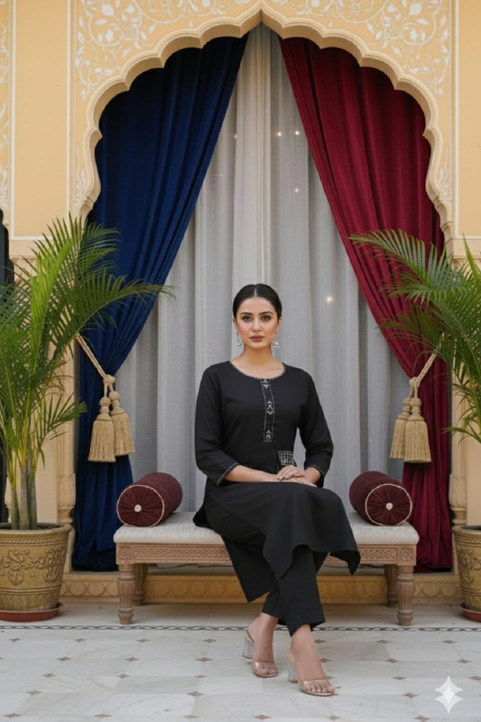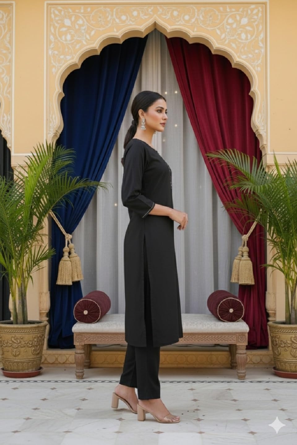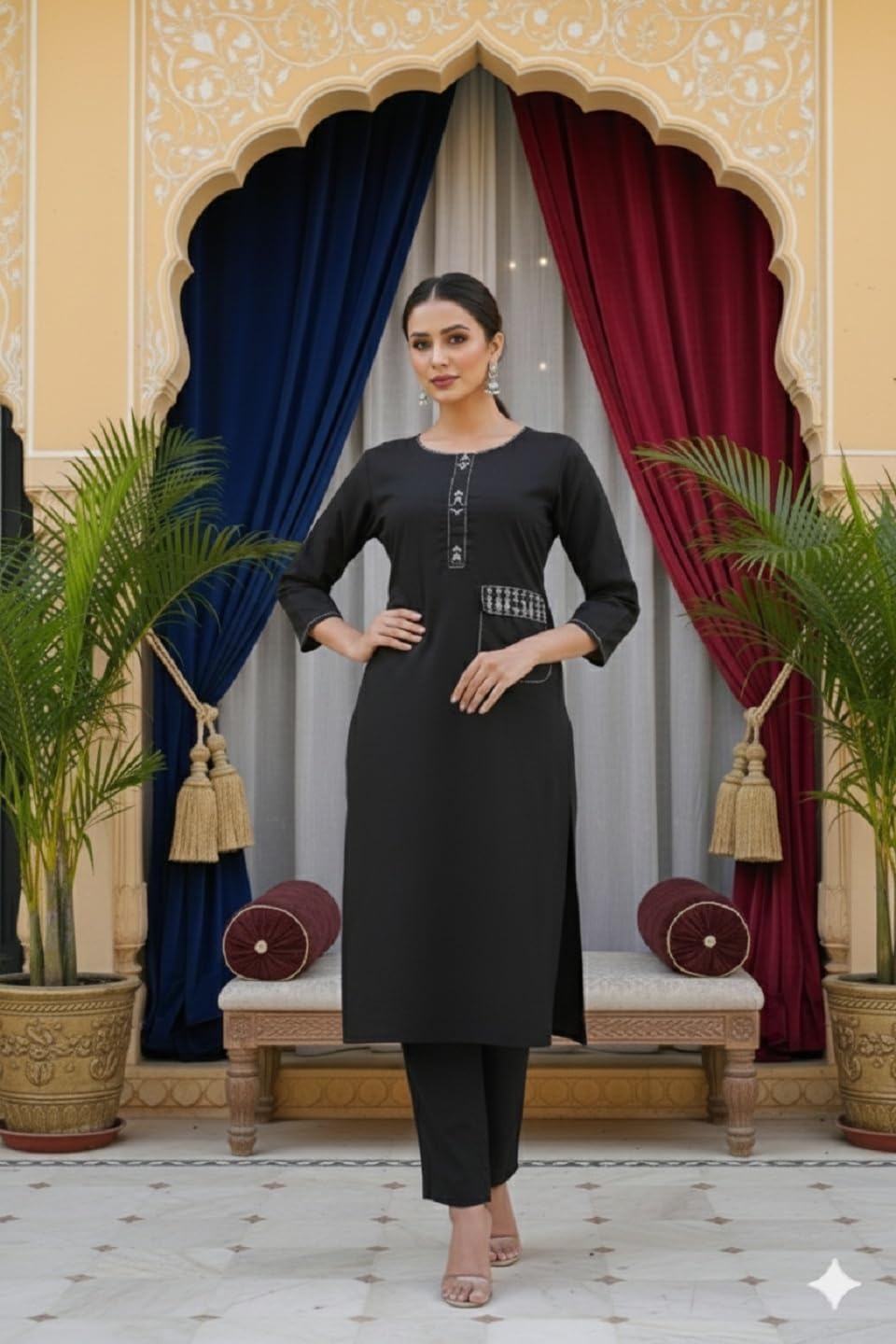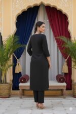 Elegant black embroidered kurti & pant set with round neck, 3/4th sleeves, and straight-fit pants. Perfect for office wear, casual outings, and festive occasions.