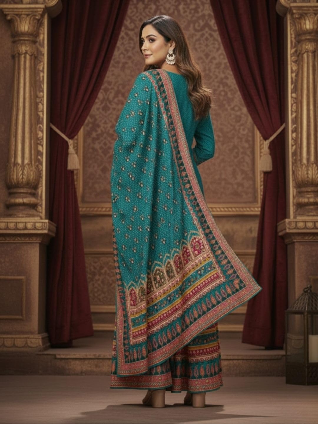 Elevate your festive and ethnic wardrobe with this beautifully crafted teal and red printed sharara set. The set features a straight-fit kurta adorned with intricate ethnic motifs and a rich colour palette that adds a vibrant traditional touch