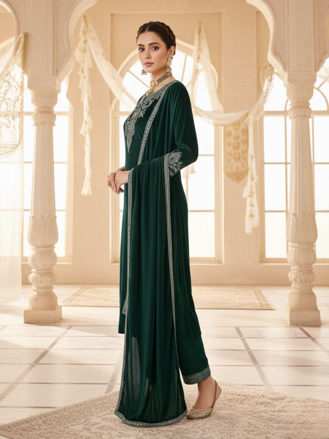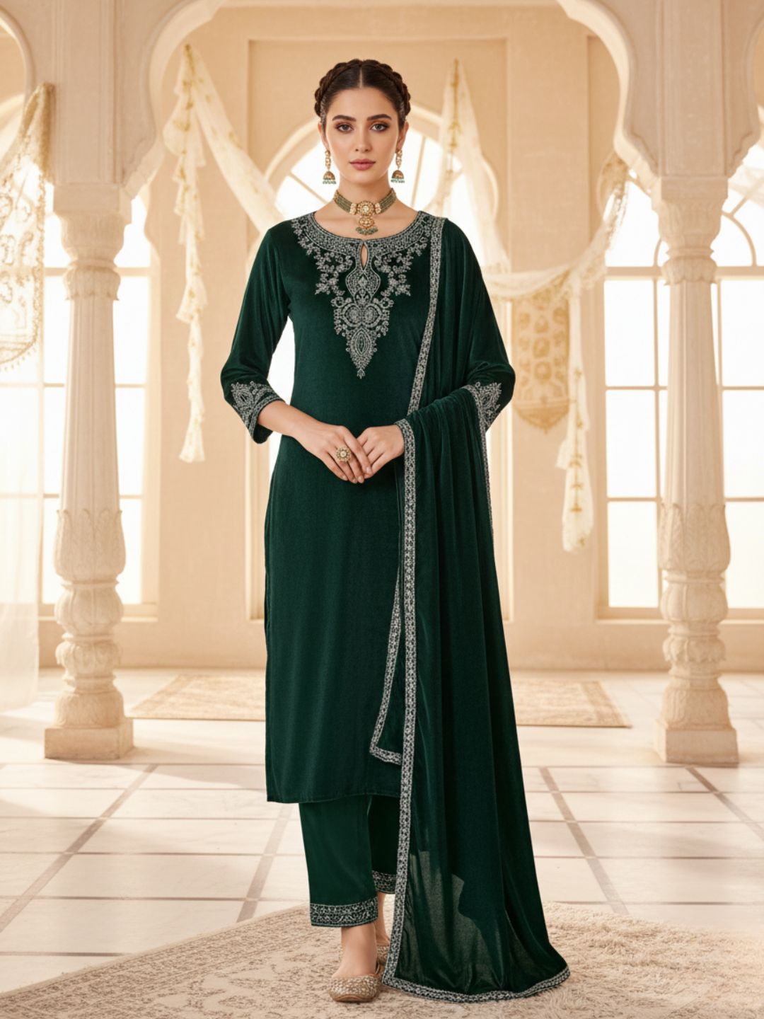 Pranisha Women Green Embroidered Velvet Kurta with Pants and Dupatta