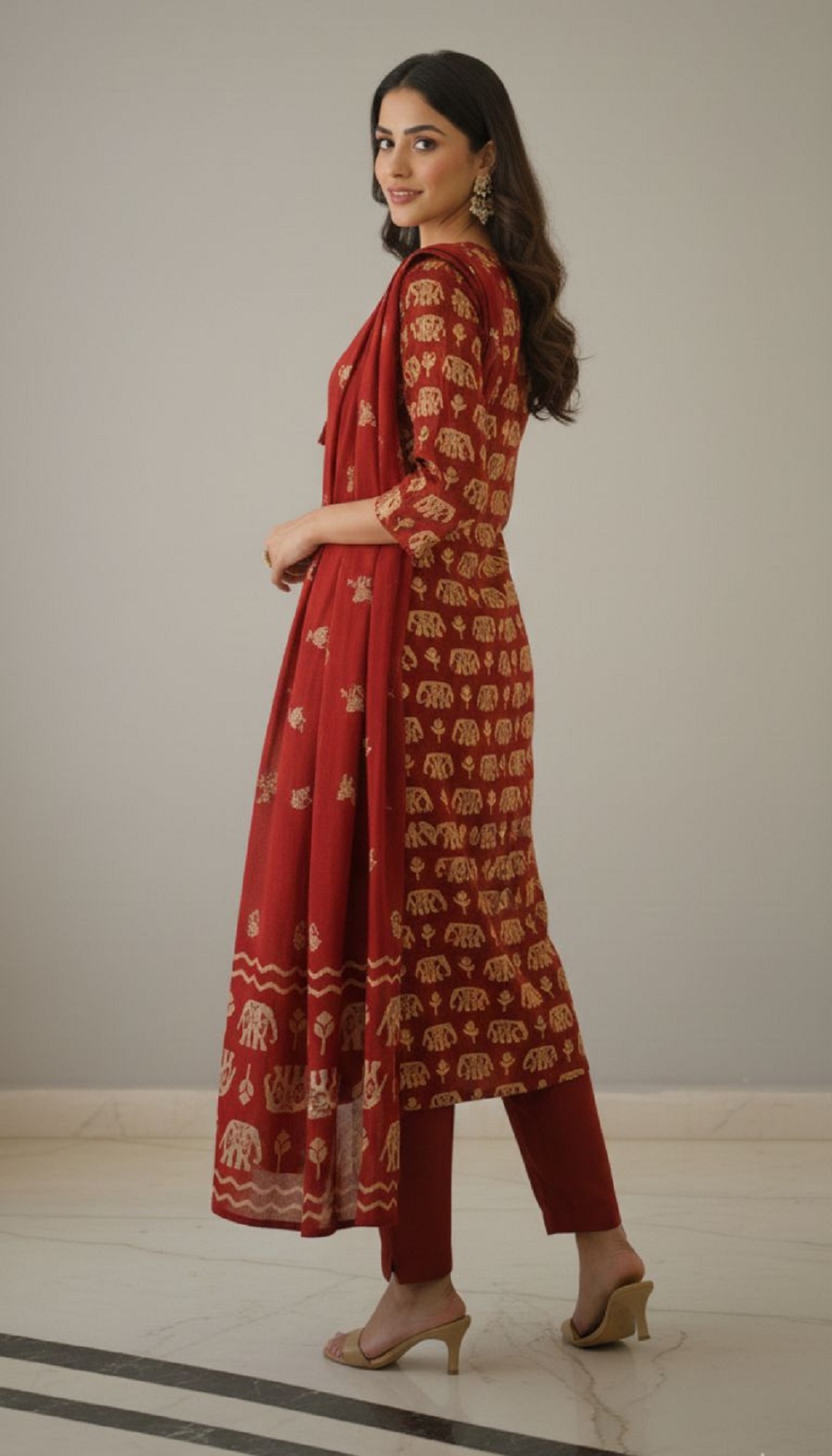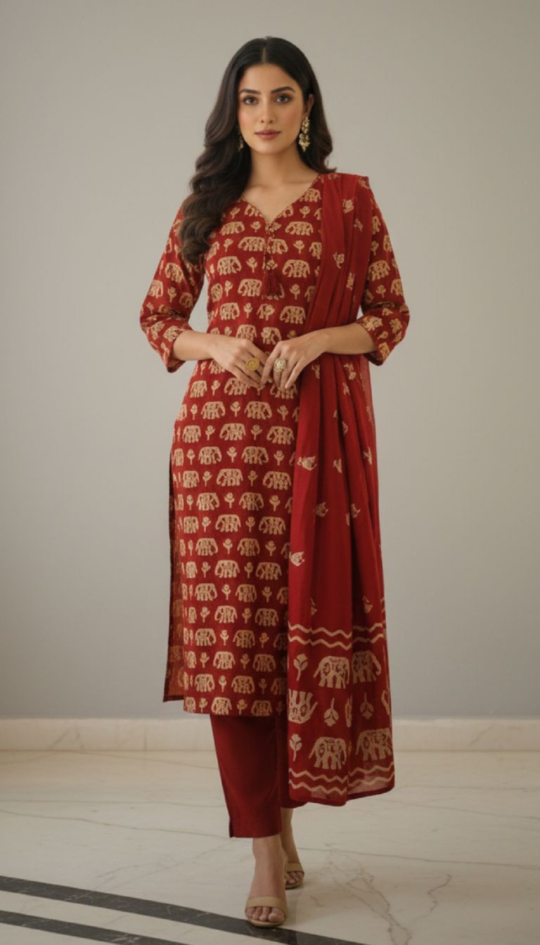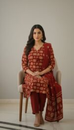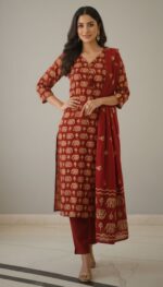 this elegant maroon printed kurta set, designed for timeless style and everyday comfort. Crafted from soft and breathable fabric, the kurta features an all-over traditional print that adds a rich ethnic charm. The set is paired with matching straight-fit pants and a coordinated dupatta, completing a graceful 3-piece ensemble.