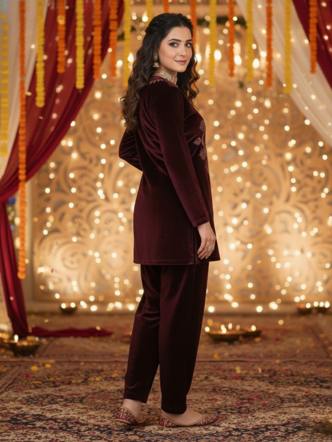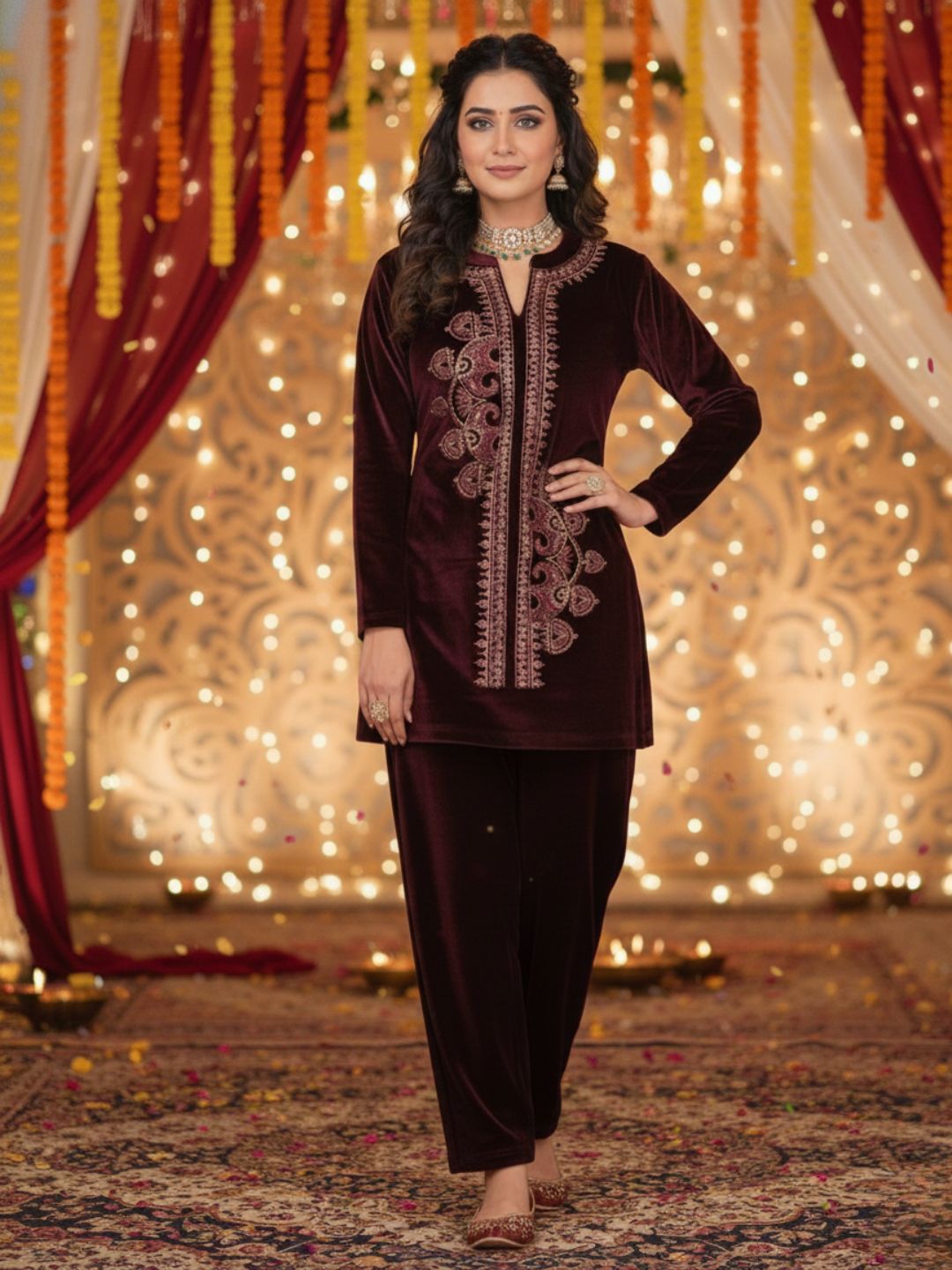 This elegant maroon velvet kurta set. Featuring rich ethnic embroidery on the front panel, this straight-fit kurta offers a luxurious look and comfortable wear.