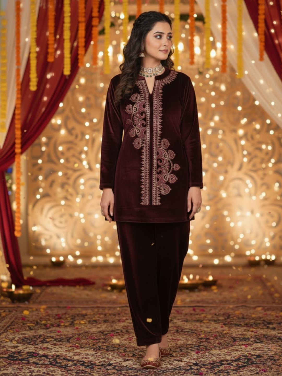 Pranisha Women Maroon Velvet Embroidered Kurta Set for Festive & Party Wear