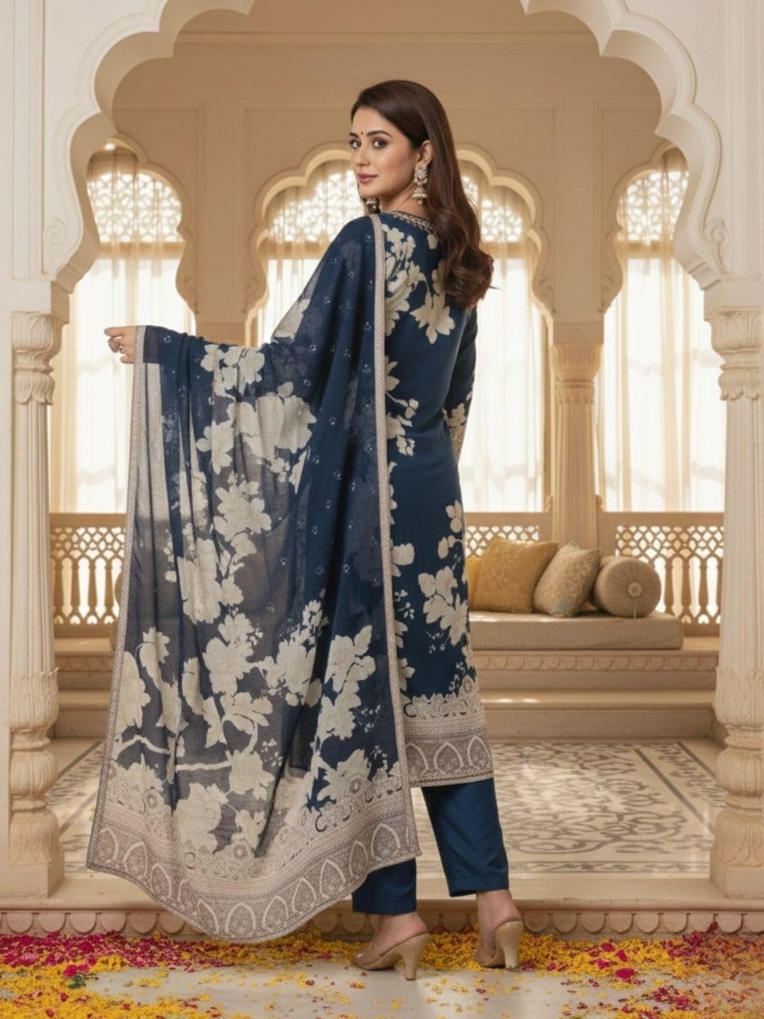 Pranisha Women Navy Blue Floral Print V-Neck Kurta with Trousers & Dupatta Set