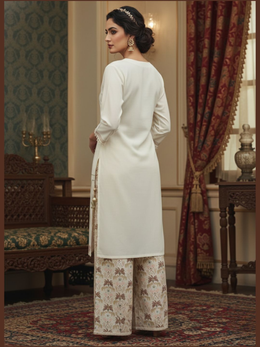 This Pranisha Women Off-White Embroidered Kurta with Printed Palazzo Pants Set. Designed to offer a perfect blend of comfort and sophistication, this ethnic set features a straight-fit kurta with a graceful V-neckline and delicate embroidery details that enhance its classic appeal