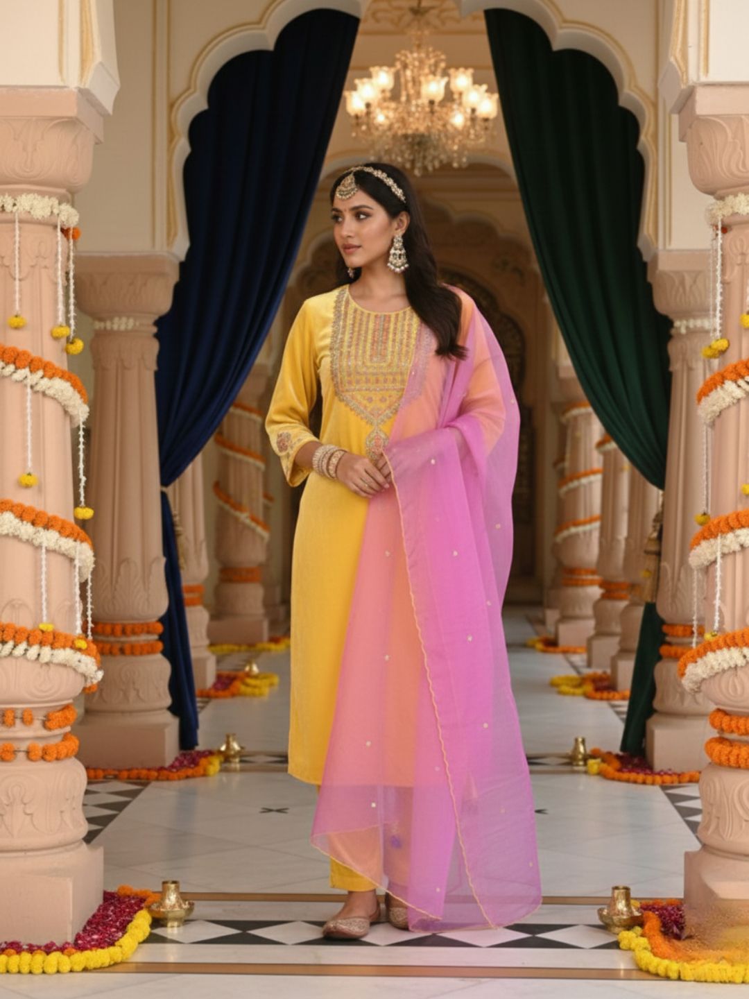 Pranisha Women Yellow Embroidered Velvet Kurta with Pants and Orange Dupatta