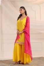 This elegant Yellow Crepe Kurta Palazzo Set with Contrast Pink Dupatta. Designed for comfort and style, this outfit is ideal for festive occasions as well as graceful everyday wear.
